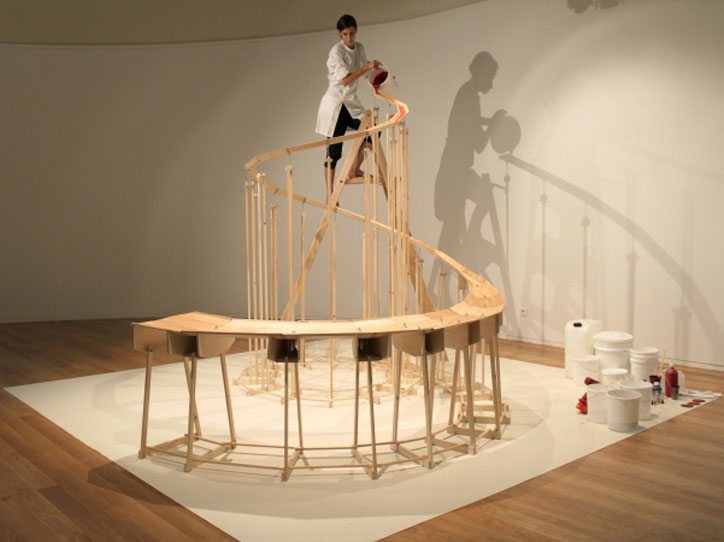 From machines that miraculously create wax chandeliers from strung wick, a pouring slide that becomes a ten meter long poly-concrete table, to ceramics that turn vivid blue with UV light, the key ingredients of their work are time and transformation. With their own concoction of creation-performance they aim to bridge creative disciplines and make works that can be understood by all.