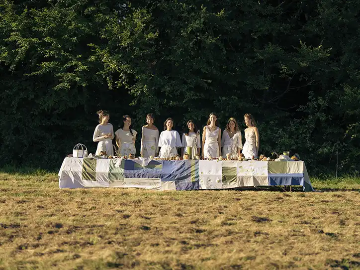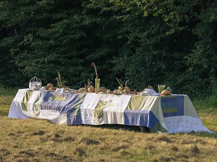 En explorant les techniques textiles telles que le patchwork et la broderie, nous redonnerons vie à une sélection de trousseaux et de linge de table anciens afin de recréer des nappes, des serviettes et tout ce qui sert à habiller notre table et ceux qui y mangent, y compris les tabliers et les bandanas. Dans le même esprit, nous donnerons une seconde vie à de la vaisselle de Limoges défectueuse ou d'occasion, en écho au patrimoine régional du lieu d'implantation de cet atelier.
