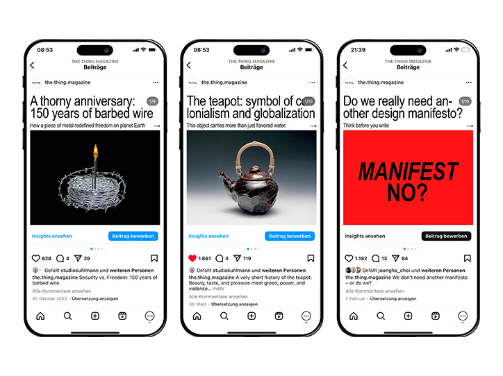 the thing Magazine est une plateforme numérique indépendante fondée en 2023 par Anton Rahlwes et Nina Sieverding. Elle propose une critique engagée du design, des tendances et des esthétiques contemporaines. Ses principaux canaux de diffusion sont Instagram (@the.thing.magazine) et une newsletter sur Substack intitulée something is missing.