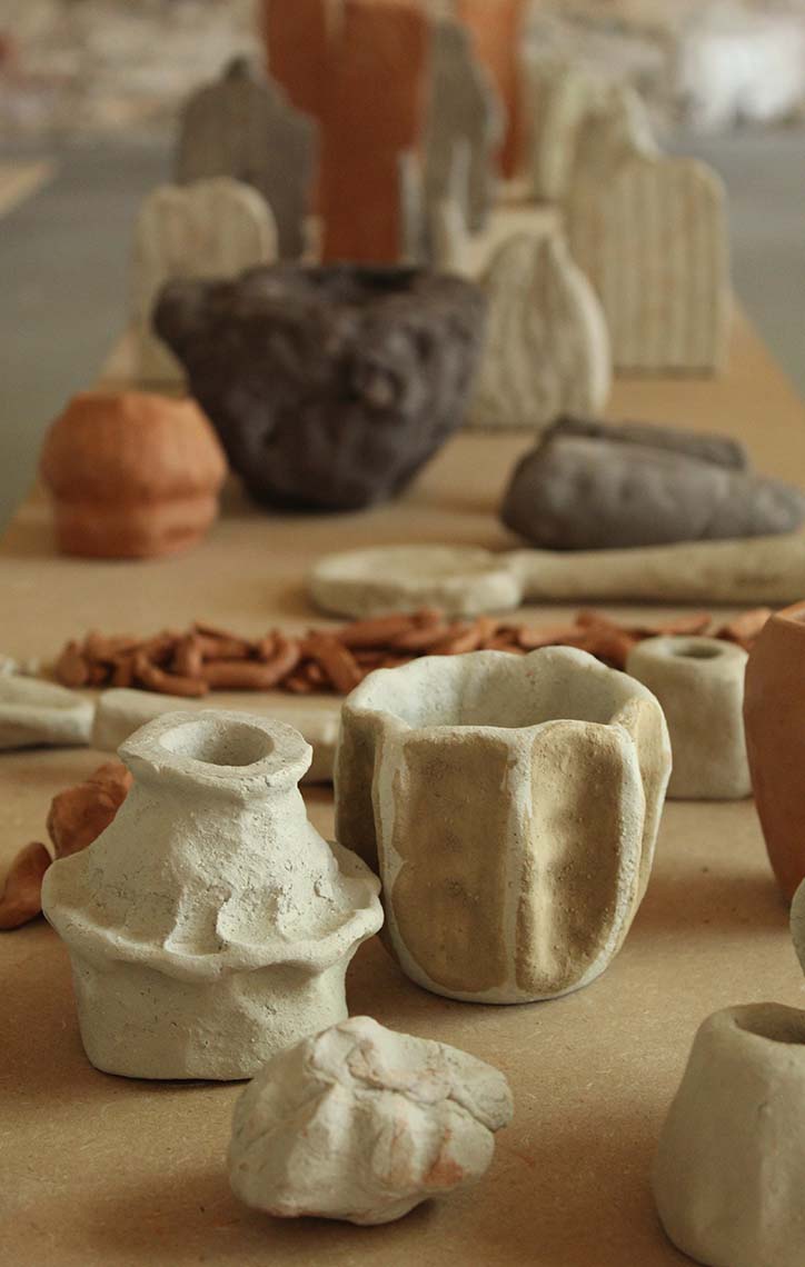The project was articulated from a direct relationship with the natural elements present in the environment: the water of the lake, fallen leaves, bark, natural clay, and the textures that emerge from the interaction between time, climate and matter. To these were added tools found by chance, fragments of objects, work remnants, or discarded materials, which were incorporated into the process of stamping and formalisation.