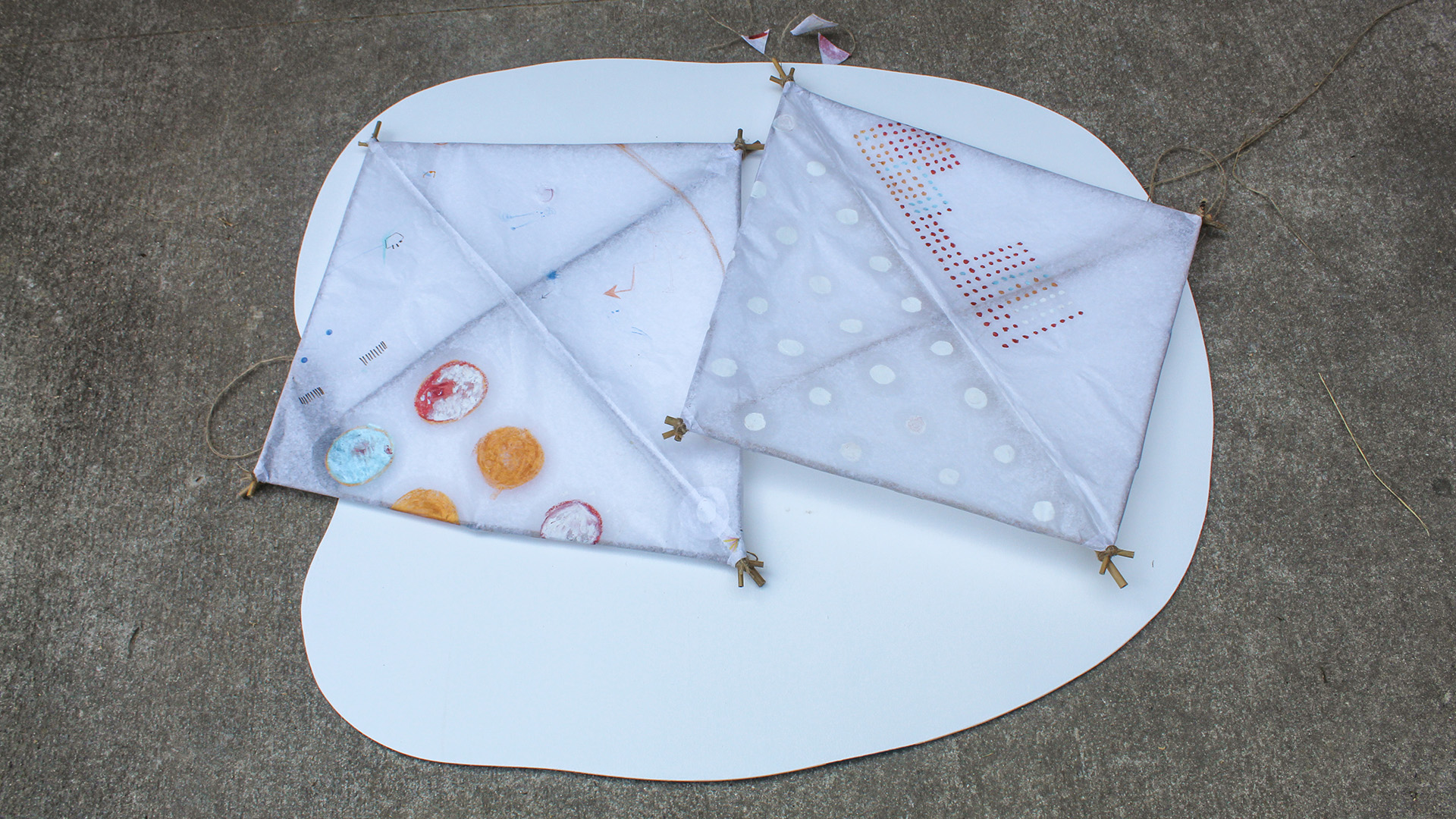 During her residency at Domaine de Boisbuchet, she developed a multi-faceted project combining performance, drawing, and object-making. She presented a display of furniture, including an elliptic MDF plate with painted details placed on a square table, alongside two bamboo kites decorated with cosmogram drawings, prototypes for potential flying objects.