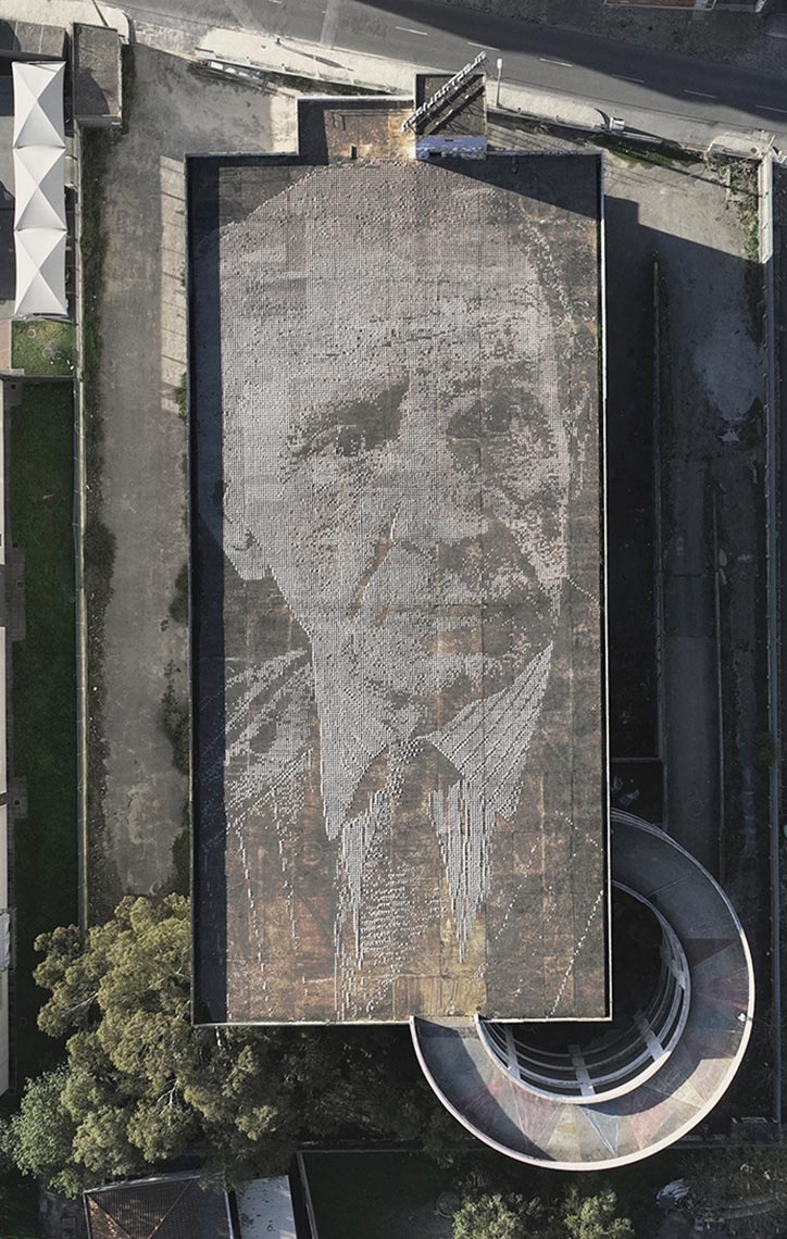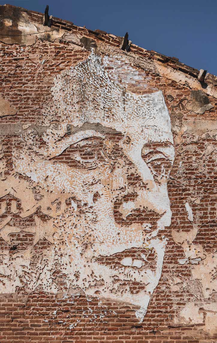 Working with processes that emphasise contrast and friction, Vhils creates by means of destruction – carving, drilling, etching, and even blasting with explosives. Presenting this approach as a means of “creative destruction”, he compares it to the work of an archaeologist who removes layers of soil in order to expose what lies buried beneath.