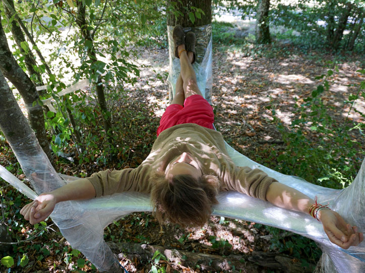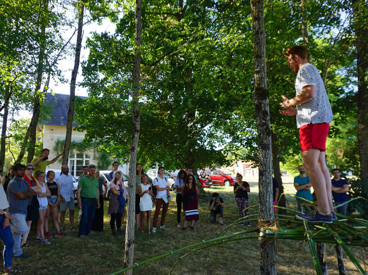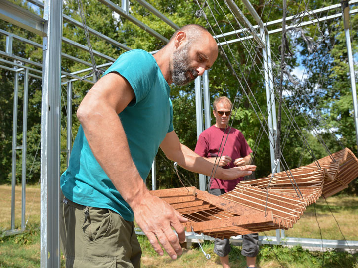 Participants of this workshop develop a spatial structure using accessible and low-tech materials. Our goal is a re-interpretation or invention of an analogue, hands-on technology for installation production that results in the realization of a parasitic attachment to an existing building or natural structure. Participants will develop individual solutions and details with scale models and formal languages that emerge from the technology they use. The final installation shall explore the altered experiences of Boisbuchet’s visitors and question the health and security regulations that nowadays dominate the architectural production.
