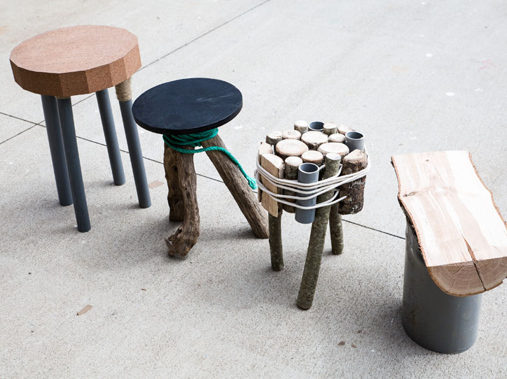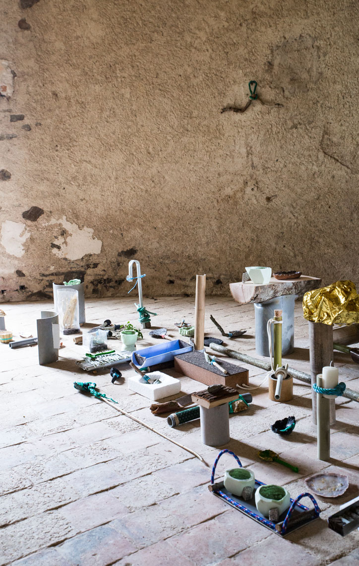 PVC pipes, nylon rope, plaster or textile will encounter branches, stones and soil, to give birth to weird neo-archaic domestic objects.