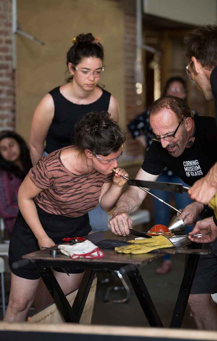 Live glassblowing demonstrations (offered at the Museum, on the road, and at sea on Celebrity Cruises) bring the material to life. Daily Make Your Own Glass experiences at the Museum enable visitors to create work in a state-of-the-art glassmaking studio. The campus in Corning, NY, includes a year-round glassmaking school, The Studio, and the Rakow Research Library, the world’s preeminent collection of materials on the art and history of glass.